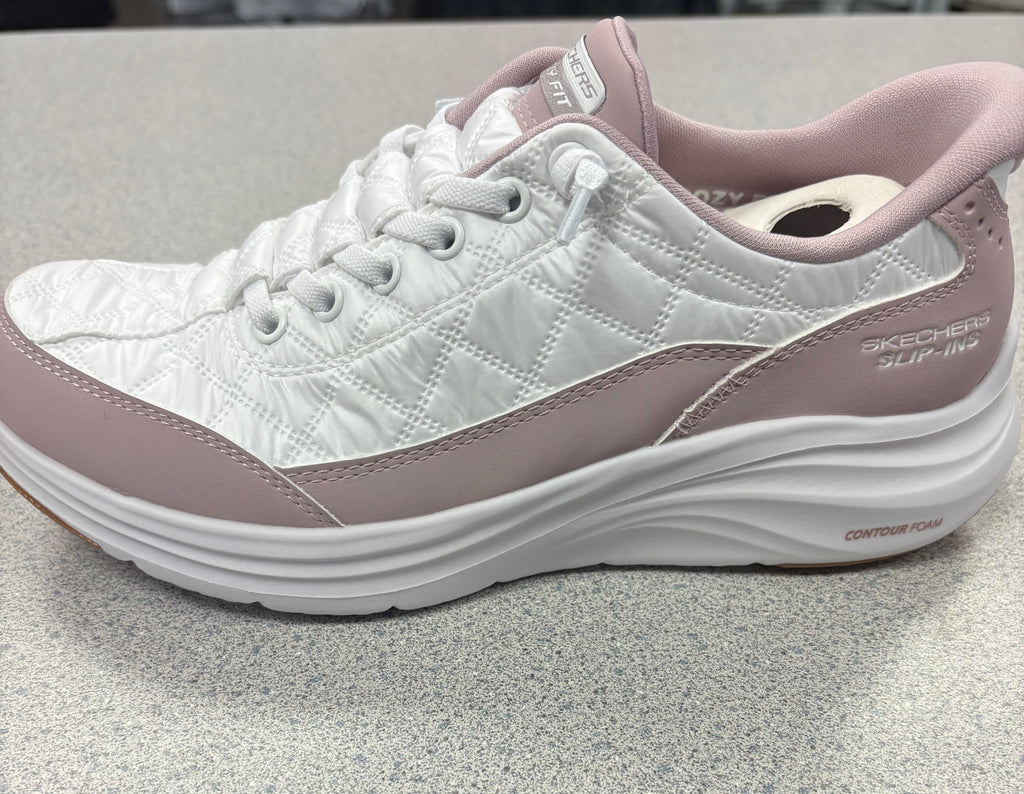 Surround your feet in effortless comfort wearing Skechers Hands Free Slip-ins®: Contour Foam™ - Cozy Fit™. Designed with our Heel Pillow®, this slip-on style features a quilted Cozy Fit™ and synthetic overlay upper with tied-off stretch laces, Contour Foam™ midsole cushioning, and our signature cushioned Skechers Air-Cooled Memory Foam® insole.